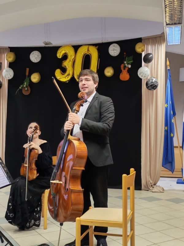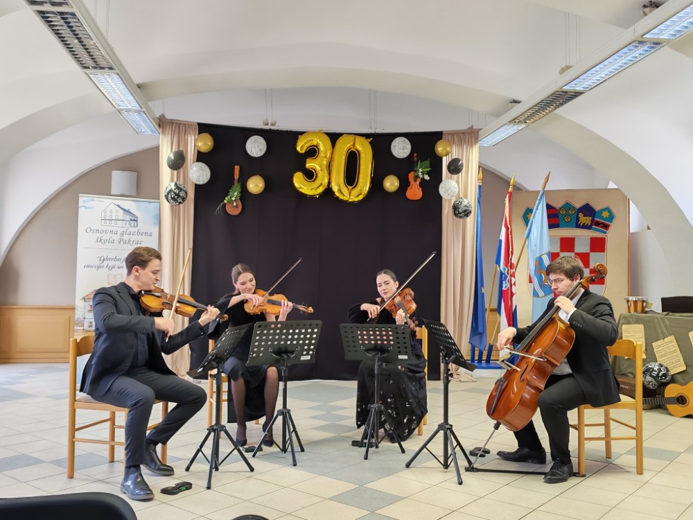 Voditelj kvarteta i prva violina, Matej Mihaljević, predstavio je svoje kolege, Jelenu Knezović na drugoj violini, Doru Šimunić na violi i Tonka Markovića na violončelu. Zahvalio se na prilici da dođu u naš grad i sviraju na ovom posebnom obilježavanju, a ravnateljica OGŠ im je pritom uručila prigodne poklone i zahvalila se što su večer obogatili svojom izvedbom.