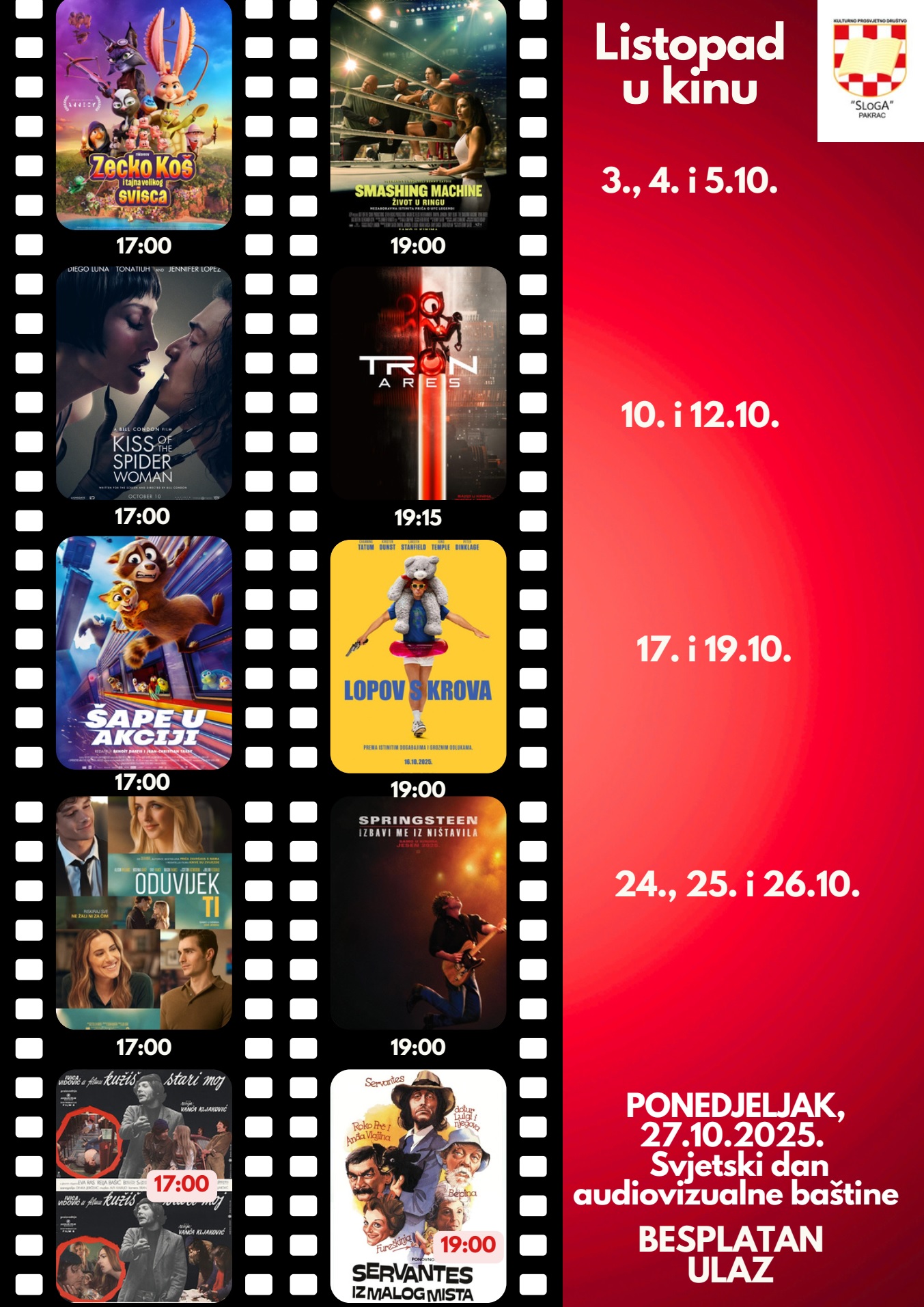 Posebno izdvajamo ponedjeljak, 27. listopada, kada obilježava,o Svjetski dan audiovizualne baštine. Tim povodom ulaz na projekciju je potpuno besplatan – idealna prilika da u kino povedete obitelj ili prijatelje.