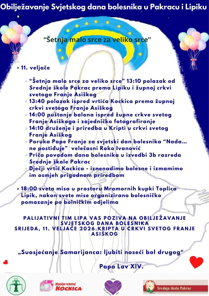 U programu sudjeluju učenici 3. b razreda Srednje škole Pakrac te djeca iz Dječjeg vrtića Kockica, a tom će prilikom biti pročitana i poruka pape Franje povodom Svjetskog dana bolesnika.