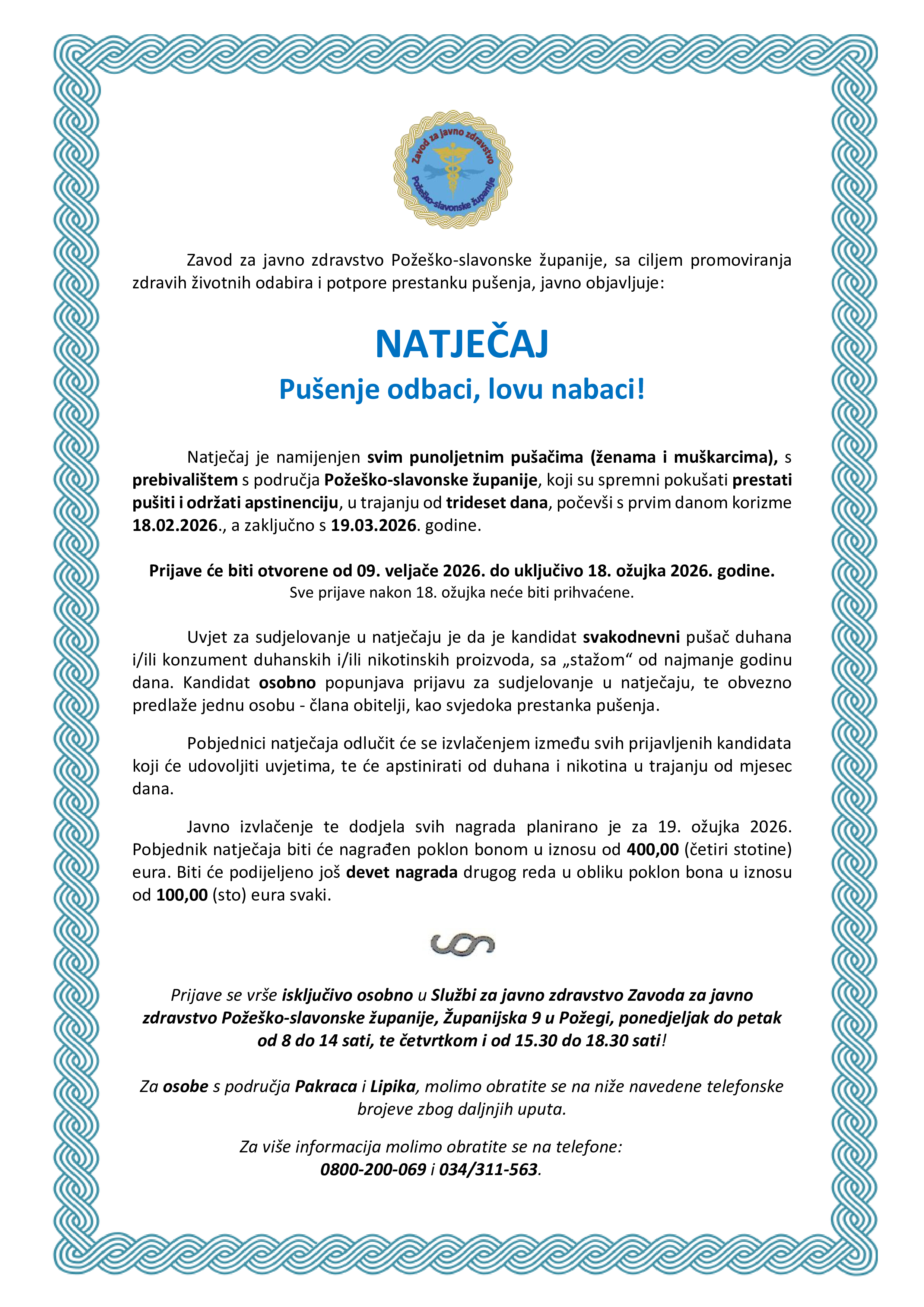 Osobe s područja Pakraca i Lipika mole se da se, radi daljnjih uputa, obrate na dolje navedene telefonske brojeve. Za više informacija molimo obratite se na telefone: 0800 200 069 i 034/311-563. Natječaj je dosad pokazao iznimne rezultate te je svaki 5. pušač dugoročno uspio prestati pušiti.
