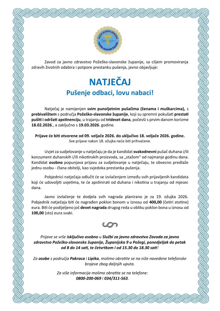 Natječaj je namijenjen svim punoljetnim pušačima oba spola s prebivalištem na području Požeško-slavonske županije. Potrebno je imati više od godinu dana pušačkog „staža“ i želju za prestankom pušenja. Natječaj će biti otvoren od 9. veljače 2026. do zaključno 18. veljače 2026. godine. Sve prijave zaprimljene nakon 18. veljače 2026. neće biti prihvaćene.