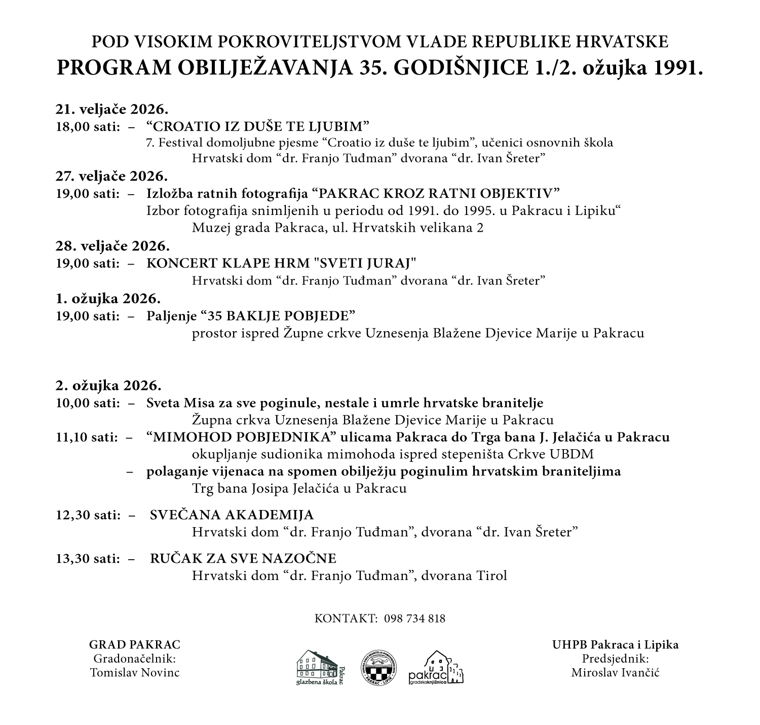 Program obilježavanja započinje 21. veljače 7. Dječjim festivalom domoljubne pjesme „Croatio iz duše te ljubim“, namijenjenim osnovnoškolcima. Dana 27. veljače bit će otvorena izložba ratnih fotografija „Pakrac kroz ratni objektiv“, dok je za 28. veljače u Hrvatskom domu „dr. Franjo Tuđman“ predviđen koncert Klape HRM „Sveti Juraj“. U večernjim satima 1. ožujka, ispred Župne crkve Uznesenja Blažene Djevice Marije, simbolično će se zapaliti 35 baklji u povodu 35 godina od početka Domovinskog rata.