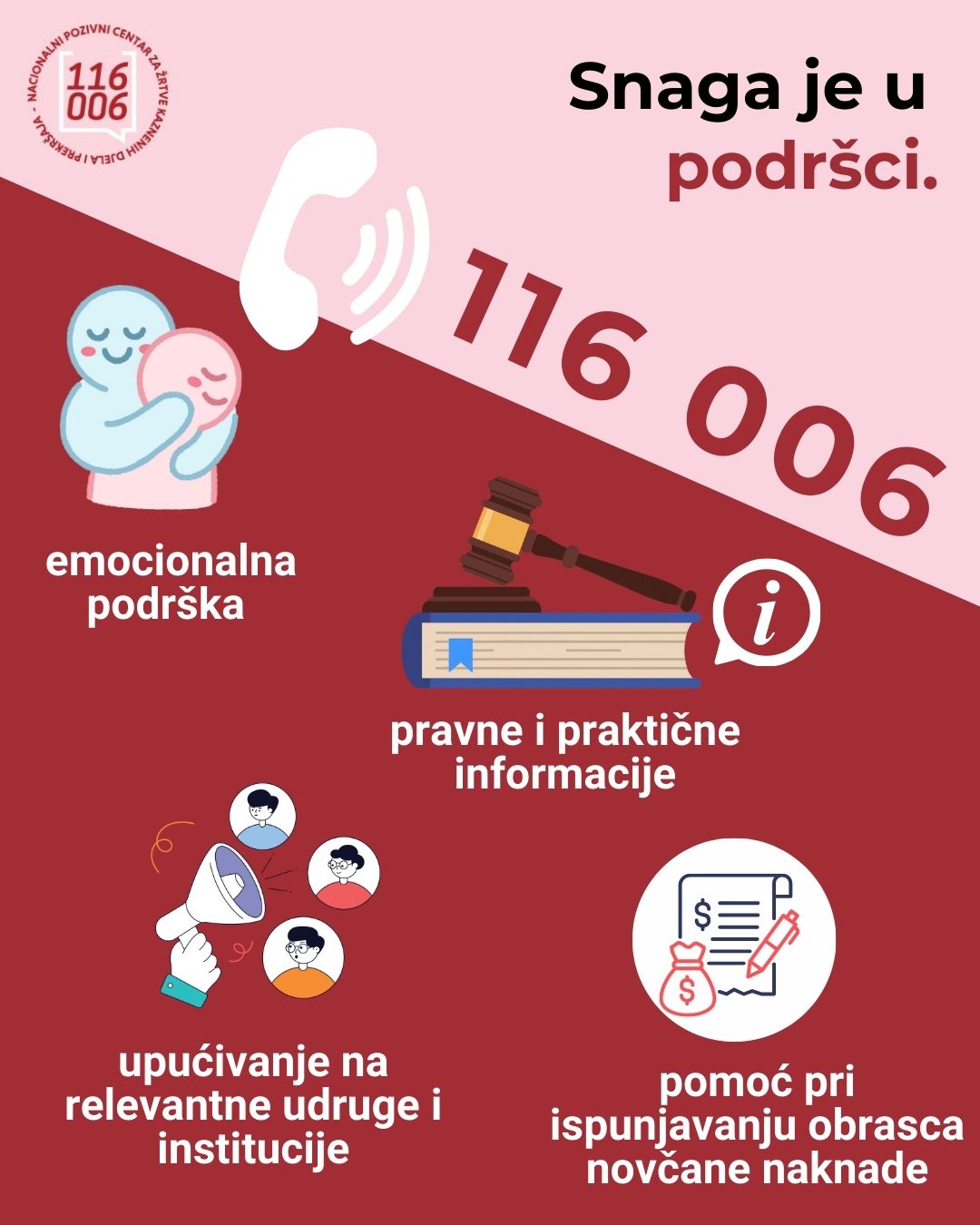 Ako ste žrtva kaznenog djela ili prekršaja, niste spremni o tome razgovarati s bliskim osobama ili ne znate kome se obratiti, možete nazvati 116 006. Anonimna i besplatna linija dostupna je 24 sata dnevno, 365 dana u godini.