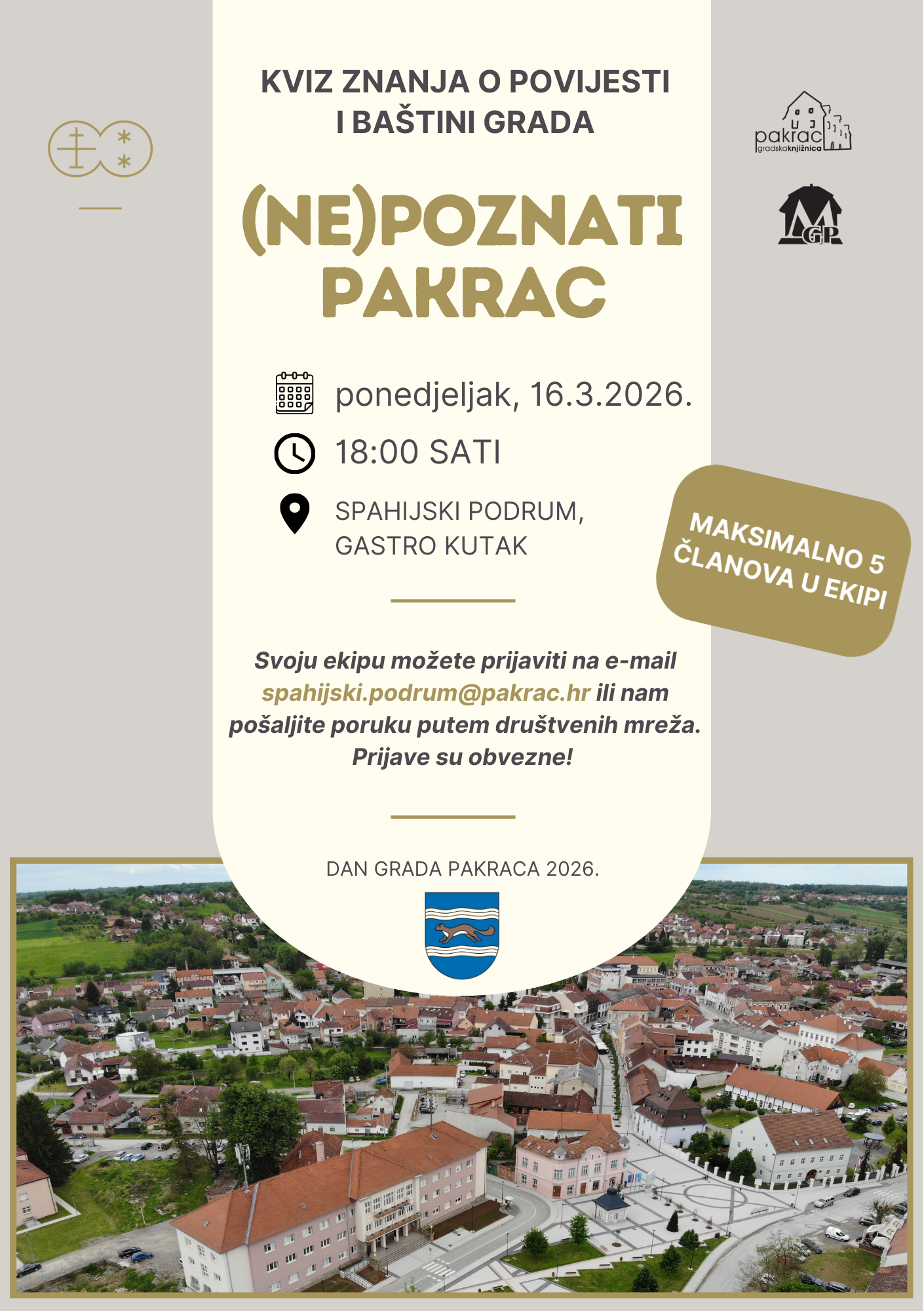 Kviz će se održati u ponedjeljak, 16. ožujka u 18 sati, u Spahijskom podrumu (Gastro kutak). Svoju ekipu možete prijaviti putem e-maila Ova e-mail adresa je zaštićena od spambota. Potrebno je omogućiti JavaScript da je vidite. ili porukom putem društvenih mreža, a prijave su obavezne i otvorene do 13. ožujka, stoga požurite, okupite tim, zagrijte moždane vijuge i pridružite se.