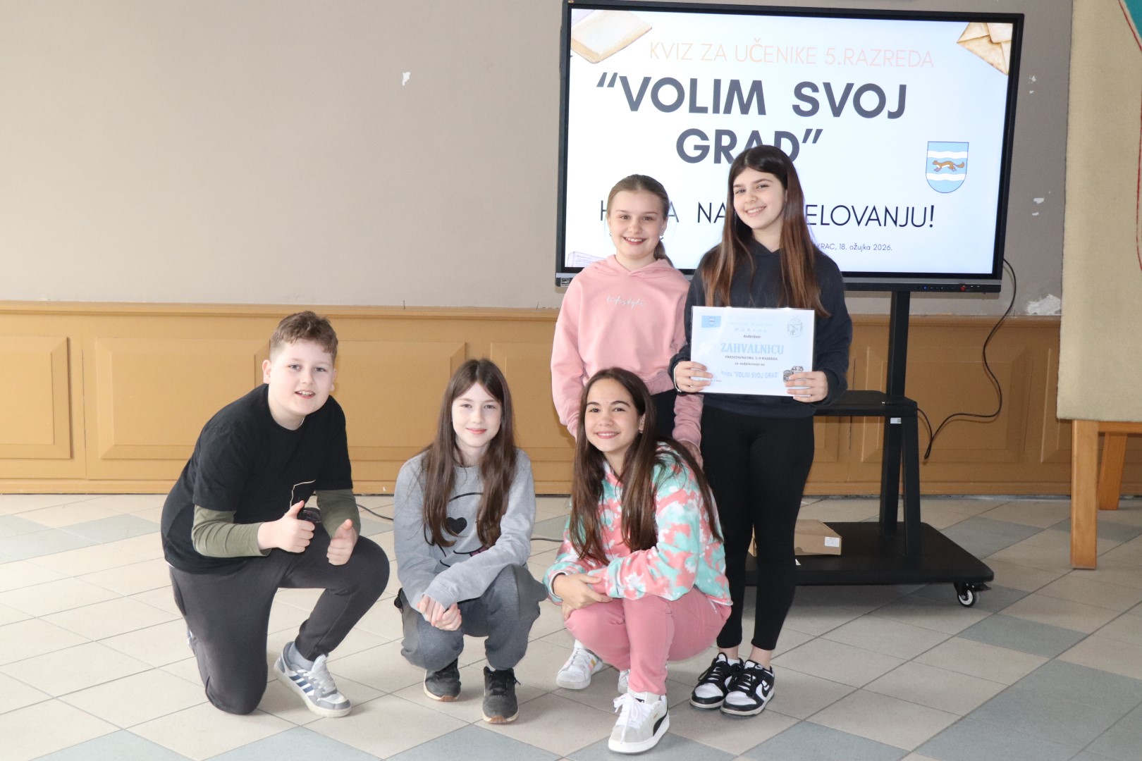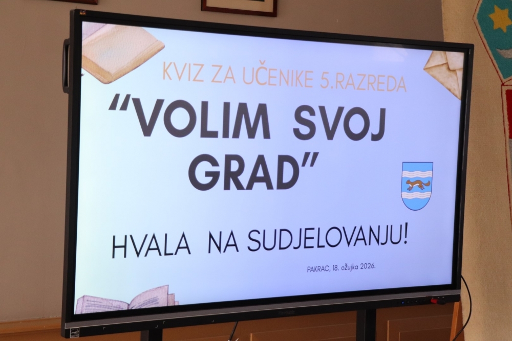 Kako se zove prvi društveni, multimedijalni, kulturni, turistički i edukativni centar u Republici Hrvatskoj? Koja je najhumanija akcija Domovinskog rata? Gdje se u Pakracu nalazila kovnica novca? – neka su od ukupno 37 pitanja na koja su odgovarali učenici petih razreda Osnovne škole braće Radića Pakrac u osmom po redu učeničkom kvizu „Volim svoj grad“ koji je 18. ožujka povodom Dana Grada Pakraca održan u Gradskoj vijećnici kurije Janković, a najuspješniji su bili učenici 5.d razreda – Nikolina Dugina, Mirta Ećimović, Greta Fričer, Dorian Hurmić i Tara Sarajlija.