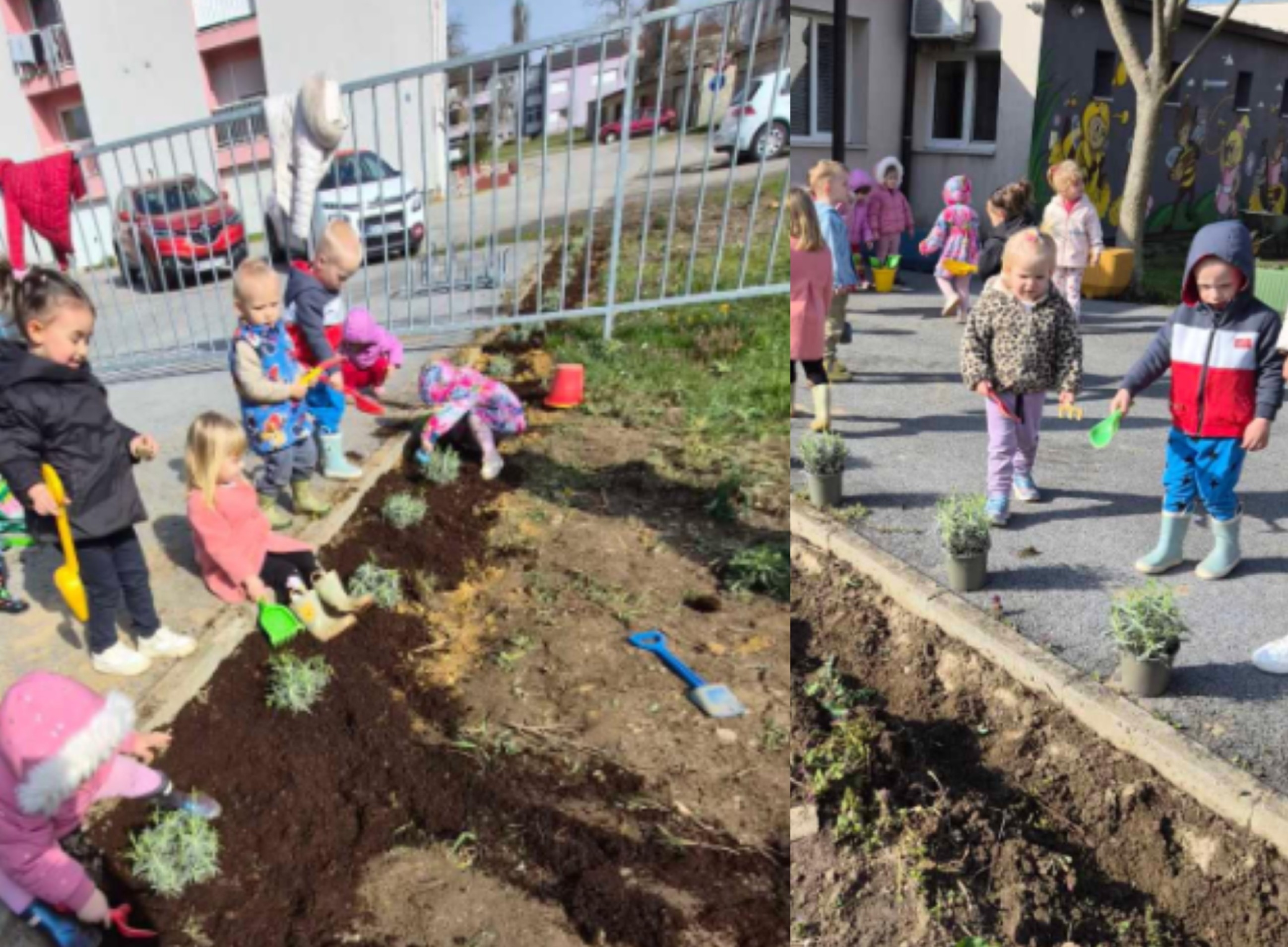 U pomoć nam je priskočio gospodin Mateo Biondić, koji je bagerom, na radost djeci, besplatno počupao korijenje stare živice i pripremio podlogu za sadnju na čemu smo mu neizmjerno zahvalni. Naši jasličanci iz skupina Kapljice i Sovice zasukali su rukave i posadili lavandu. Tragovi truda i rada bili su vidljivi na radost roditelja u cipelama, kosi i odjeći, ali i na našem jasličkom ulazu.