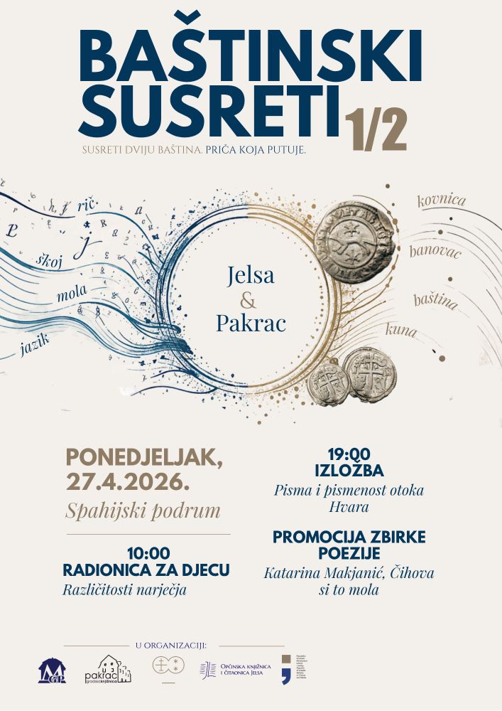 Jedinstveni projekt suradnje Gradske knjižnice Pakrac, Muzeja grada Pakraca i Općinske knjižnice i čitaonice Jelsa (otok Hvar) predstavit će se u Spahijskom podrumu kroz projekt „Baštinski susreti“ koji je usmjeren je na poticanje kulturne raznolikosti, očuvanje baštine i edukaciju svih generacija, s posebnim naglaskom na povijest, jezik i razvoj pismenosti.