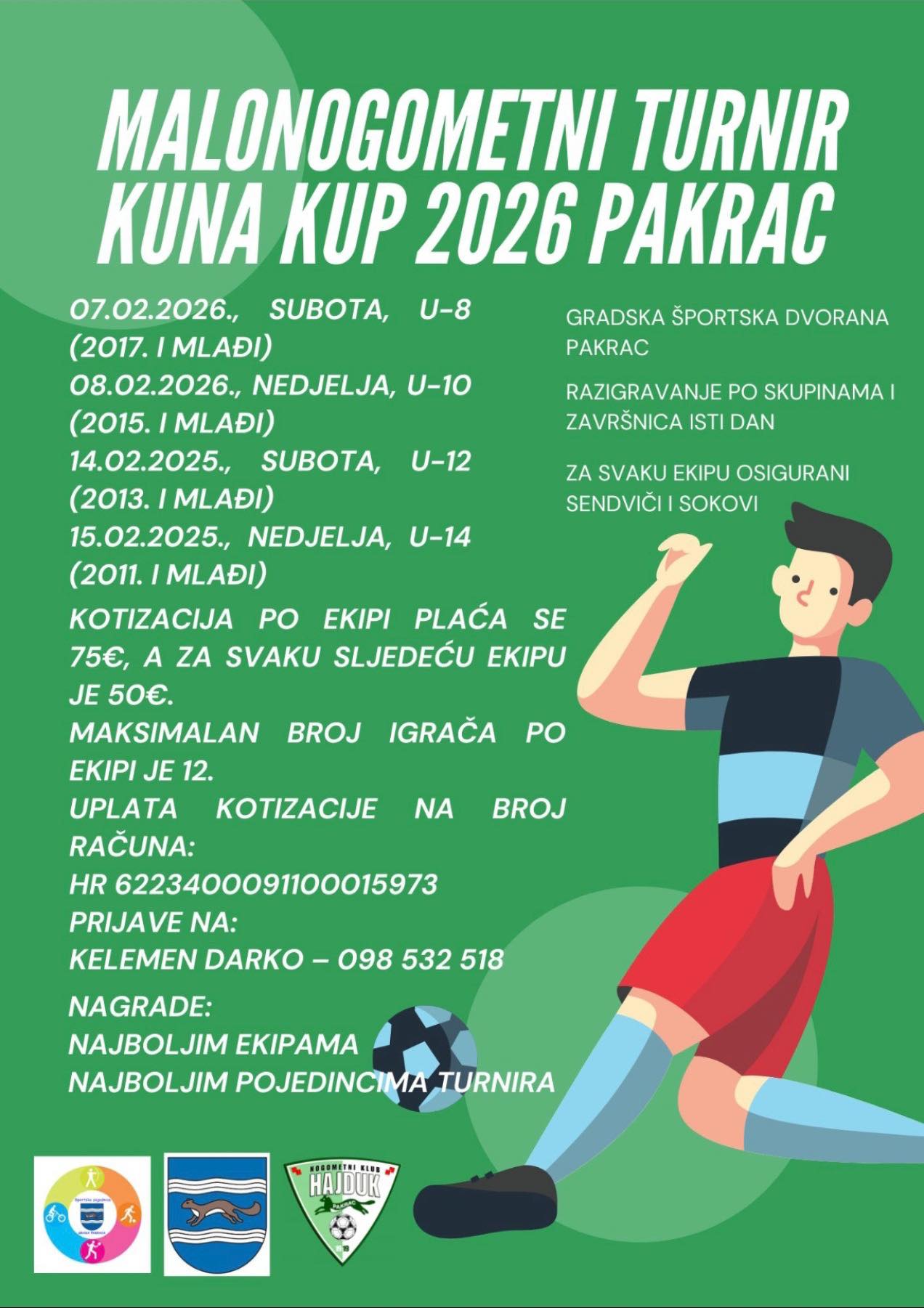 Tradicionalni „Kuna kup“ u organizaciji Nogometnog kluba „Hajduk“ Pakrac te pod pokroviteljstvom Grada Pakraca i Sportske zajednice Grada Pakraca bit će odigran u nadolazeća dva vikenda 7. i 8. veljače te 14. i 15. veljače, a ove godine u gradskoj sportskoj dvorani natjecat će se 64 ekipe kroz četiri starosne kategorije, što je ujedno i maksimalan broj ekipa koji se mogao prijaviti na turnir. Osim uz domaće Pakračane i Lipičane, svoje malonogometne sposobnosti prikazat će i mladići i gotovo svih okolnih mjesta.
