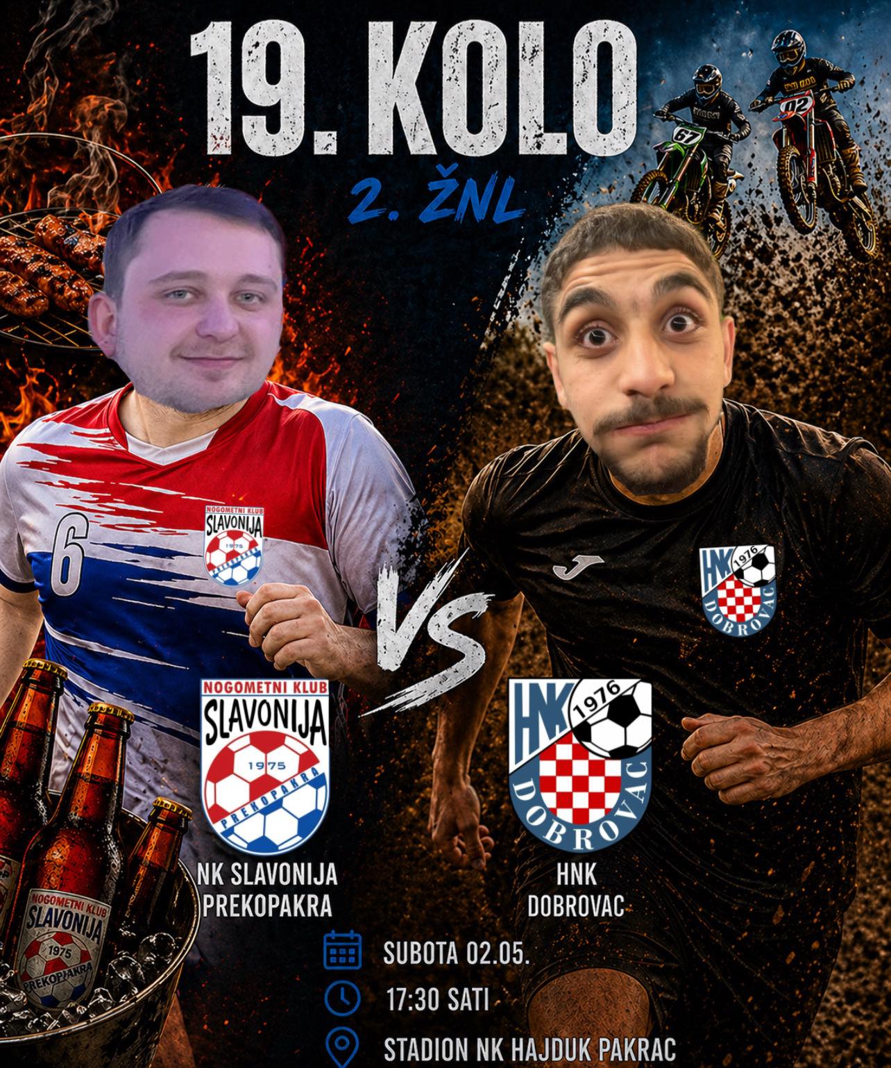 Subotnji lokalni derbi između Slavonije Prekopakra i Dobrovca koji je trebao biti odigran u 17.30 na prekopakranskom igralištu u Matkovcu, prebačen je na Gradski stadion Pakrac budući da će u tom periodu klupske prostorije Slavonije biti zauzete zbog nadolazeće nedjeljne motocross utrke Bljesak u Matkovcu, dojavili su iz Nogometnog kluba Slavonija Prekopakra.
