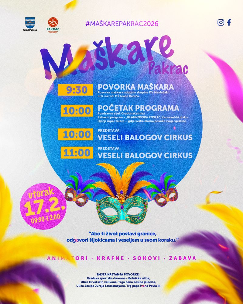 U utorak, 17. veljače 2026., Pakrac ponovno postaje grad smijeha, boja i dobre zabave! Pridružite nam se na tradicionalnim Maškarama u Pakracu, koje će od 9.30 do 12.00 sati ispuniti gradske ulice veseljem, glazbom i razigranim maskama.