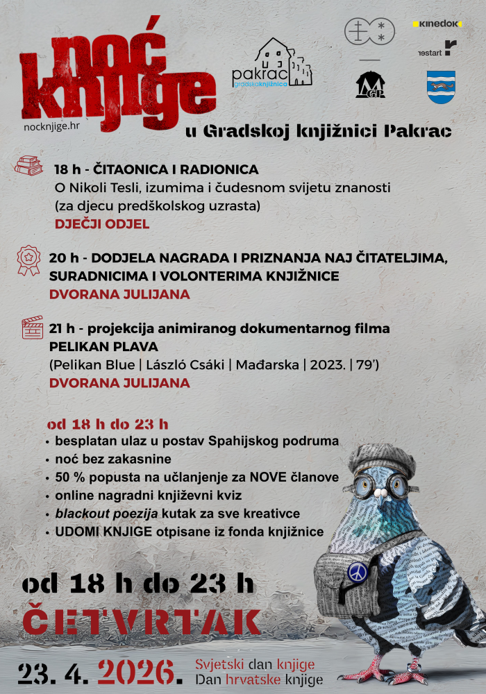 Knjižnična ekipa u suradnji s Muzejom grada Pakraca te suradnicima iz KineDok Hrvatska pripremila je puno zanimljivih sadržaja, druženja i kutaka te pozivaju sve ljubitelje knjige, znatiželjnike i kreativce svih generacija da se pridruže u večeri ispunjenoj pričama, znanošću, filmom i posebnom atmosferom koju donosi ova "noćna smjena" u knjižnici.
